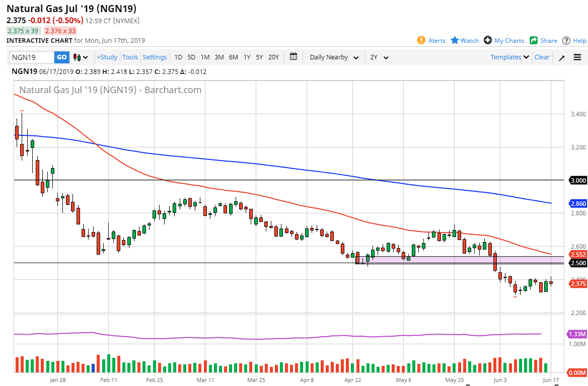 Natural gas markets went back and forth during trading on Monday, as we continue to bounce around the $2.40 level. That being said, I still like the idea of waiting for rallies that I can sell. This will be especially true near the $2.50 level which has been important more than once. The 50 day EMA sits just above there as well, so it’s very likely that there will be plenty of reasons for sellers to attack at that point.