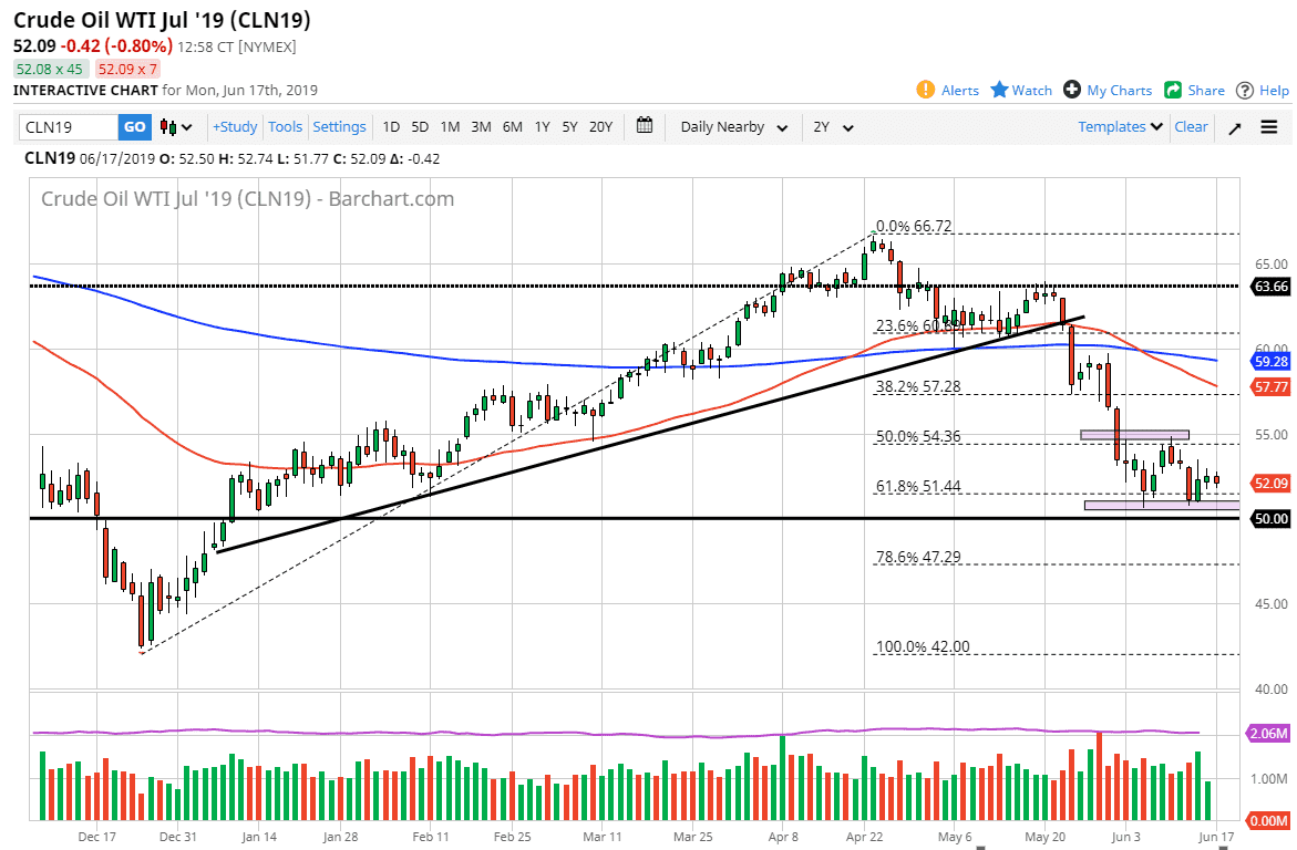 That being said, we know that there is a certain amount of supply/demand issues. If the US dollar rolls over, then it’s very likely that we could get a bit of a boost because of currency alone. At this point, $50 below is massive support, just as the $55 level above is massive resistance. As we are bouncing around in this area, it makes sense to wait for more of a fundamental reason to break out. In the short term, I would expect to see the support hold.